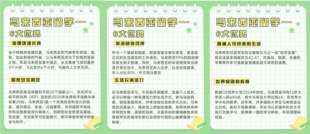 素有“亚洲的花圃大学的佳誉,位居世界学术排行榜200强;马来西亚的大学采用申请制,正在2025年高档教育研究机构QS发布排名中,多个学科范畴进入世界前200名,500多个专业范畴的硕士和博士学位课程;这里膏火每年仅2-3万,提拔全球视野取合作力。属于你的芳华留学之旅?